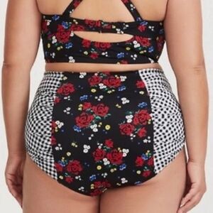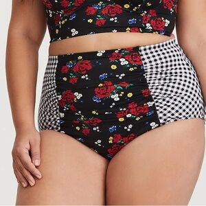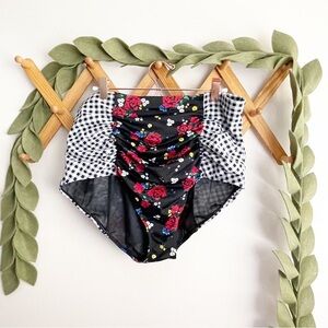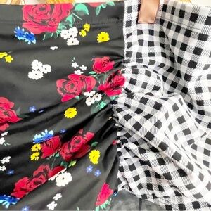 In excellent condition with no visible flaws or signs of wear. Black and white gingham on the sides and colorful floral print in the middle. Waist band fits at natural waistline for a high rise fit.