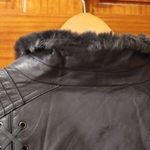 Condition: lightly worn; no major flaws. The faux leather shows typical wear for a grunge piece but still bold. Faux fur collar adds texture and warmth.