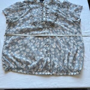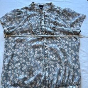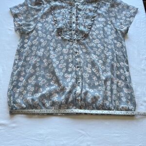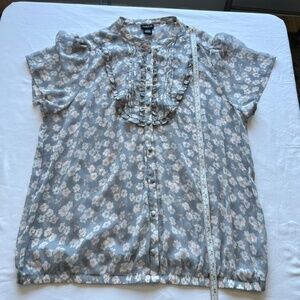 Chic gray blouse with floral pattern. Short sleeves and button front. Lightweight and stylish.