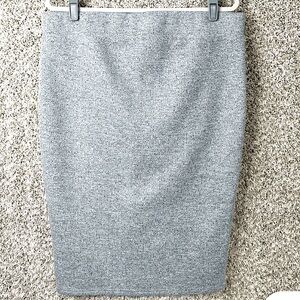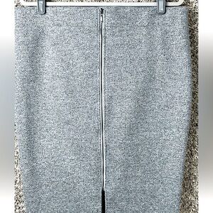 Sleek and stylish stretch ribbed pencil skirt. Features a metallic front zipper and slit. Excellent pre-loved condition. Perfect for work or evening wear.