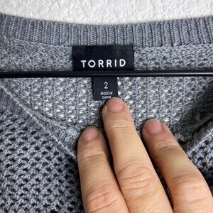 Elevate your wardrobe with this stylish Torrid gray sweater, featuring delicate crochet details at the shoulders and sleeves. Crafted from a comfortable blend of cotton and viscose, this sweater offers both warmth and breathability. Perfect for layering or wearing solo, it adds a touch of elegance to any outfit.