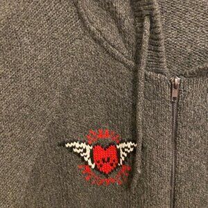 Cozy gray knit sweater with a hood. Features skull and rose embroidery. Full zip front. Perfect for casual wear. Like new condition. Womens size 2X.