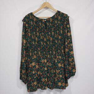 Torrid Green & Brown Floral Smocked Tunic Blouse Ruffles on shoulders Size 2