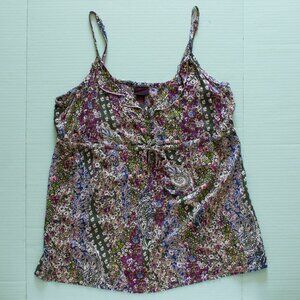 Perfect for jeans or to dress it up in summertime weather. This spaghetti tank features a faux pieced allover ditsy floral print in greens, blues, and purples. With button loop buttons, a sweetheart neckline, and ruffles, this top nods to the flower child in all of us.