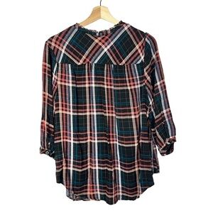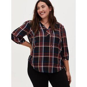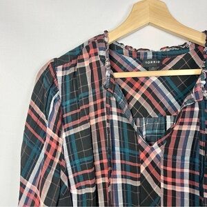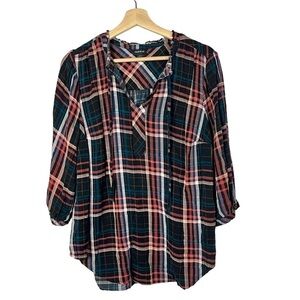 Torrid Green & Red Plaid Rayon Twill Tie Neck Long Sleeve Blouse