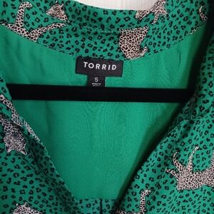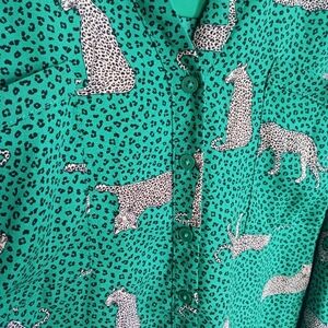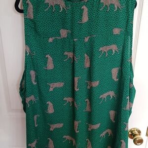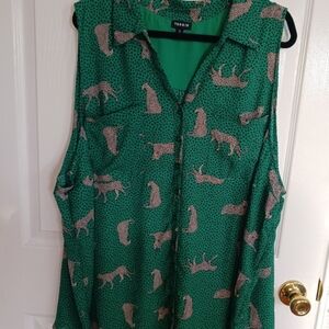 This vibrant green sleeveless blouse by Torrid features a V-neckline and a polo collar, with small white designs scattered across the fabric for a stylish contrast of leopards