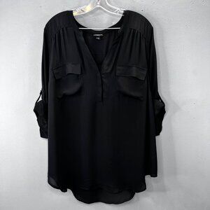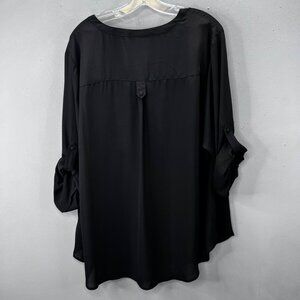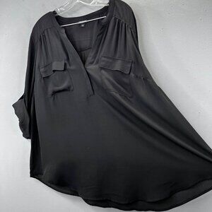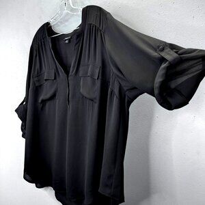 Torrid Harper pullover blouse in black. Roll tab sleeves, chest pockets, button neckline, semi sheer, flowy, loose fit. Good condition. Size 3.