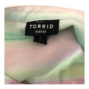 This Torrid Harper Georgette Top is a perfect addition to any wardrobe. It features a beautiful pastel striped pattern that is both stylish and versatile. The 3/4 sleeve with roll tab and collared neckline add a touch of sophistication to this blouse. Made with sheer fabric, this tunic is perfect for layering and can be dressed up or down. The size 2 plus fit is perfect for women who want a comfortable and flattering fit. Whether you're looking to update your work wardrobe or need a blouse for a special occasion, this Torrid Harper Georgette Top is sure to impress.