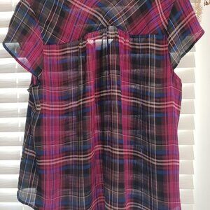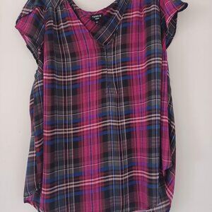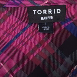 Torrid Harper Women’s 1X Pink Blue Plaid V-Neck Blouse Short Sleeve High Low Hem