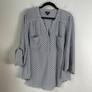 Torrid Harper Womens Plus 2X Blouse Black White Geometric Roll Tab Sleeve Shirt