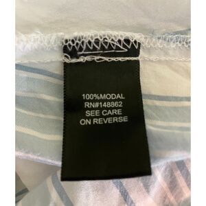 Torrid Harper chambray fit pullover 3/4 sleeve striped blouse, size 3, henley style neckline with covered buttons, 2 front pockets, rounded bottom hem slightly high low, roll tab 3/4 sleeves, super soft modal and lightweight and summery. there is a small section on the back of the neckline that looks like a flaw in the stitching I added a picture.