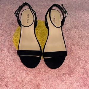 Cute, black, strappy Torrid heels. Size 11W. Super comfortable & cute with jeans, skirts, or dresses. Perfect for this fall & office jobs!