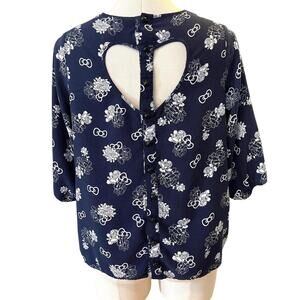 Cute navy blue challis top with all over floral print and the Hello Kitty "bow" logo. The back has a heart cutout detail and black buttons that are Hello Kitty heads.