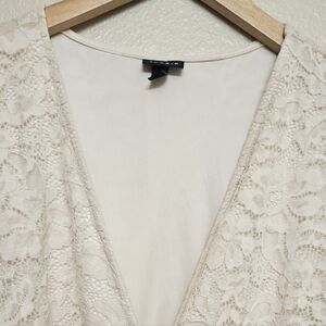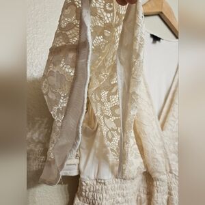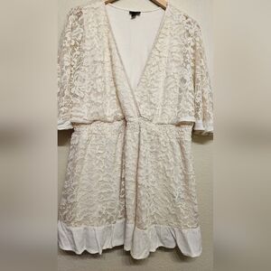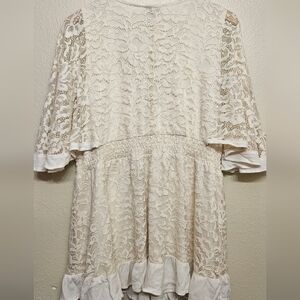 Beautiful Torrid lace blouse in a soft cream/beige color. Features an elegant all-over lace design with a flattering V-neckline and short sleeves. Smocked waist adds shape while keeping it comfortable, and the subtle ruffle hem gives it a feminine touch. Fully lined for coverage.