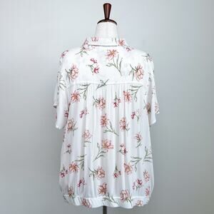 Size 3X Torrid short sleeve top. Collar neckline with a button-up front. Twist detail at bottom hem. Elastic along the bottom hem on the backside. Lightweight crepe fabric with a pretty floral print. Great condition!