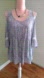 Light ivory, with blue geo- dot prints. Scoop neckline, elasticized waistline. Cold shoulder with elbow length, bell sleeves. Sleeves are detailed with an ivory crochet. Flowy bottom. 100% rayon