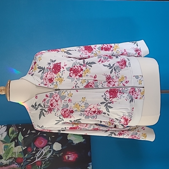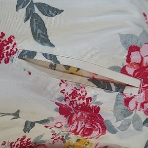 Pretty floral bomber jacket has ribbed jersey on the collar, neck and sleeves making it comfy. Colors are red, pink, yellow, sage green on a cream background. EUC no stains, snags or tears. Worn once or twice. Really!