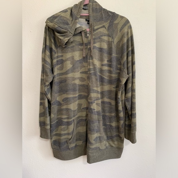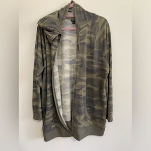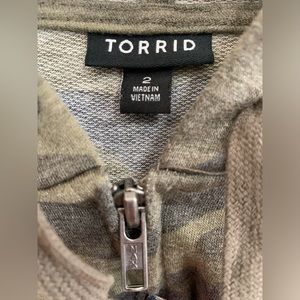 Torrid lightweight and hooded zip up jacket. This material is really soft and comfortable. Camouflage print with tons of wear left, as it was hardly worn.