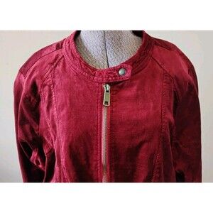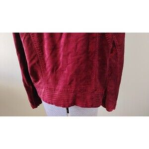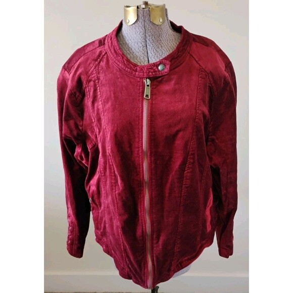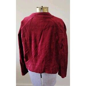 This Torrid jacket is a stylish and versatile women's outerwear piece, perfect for various occasions from casual to dress. The Torrid size 2 red velvet jacket features a unique gothic rockabilly design with a lace-up closure and motorcycle jacket style. Made with a soft velvet fabric type fabric, the jacket is lined with polyester and offers features like a full zip, pockets, lace on sleeves and side hem with a stretch fit. Ideal for the winter, fall, and spring seasons, this jacket is a standout addition to any wardrobe, adding a touch of edgy biker or punk flair.