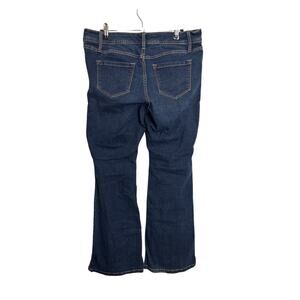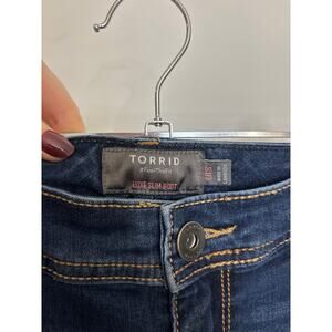 Torrid Luxe Slim Boot Jean in Dark Wash blue with bootcut leg silhouette and mid-rise fit. Features a slim silhouette through the knee that kicks into a bootcut at the hem, made from lighter-weight Super Stretch Denim with extra stretch and room at the waist. Includes five-pocket styling, button and zip fly closure, and contrast gold stitching. Good preowned condition.