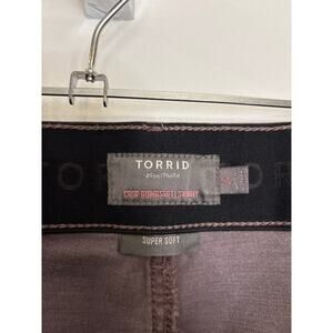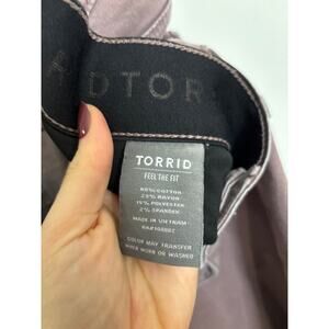 Torrid Bombshell Skinny Jean in Purple with cropped length and super soft stretch denim. Features high rise fit with gap-proof elastic waistband, front-smoothing panels, booty-shaping stitching, and classic 5-pocket design. Fabric is 65% Cotton, 20% Rayon, 13% Polyester, 2% Spandex for maximum comfort and flexibility. Good preowned condition.