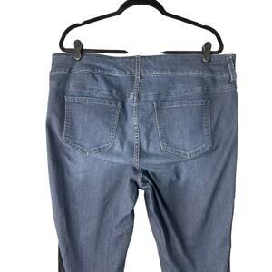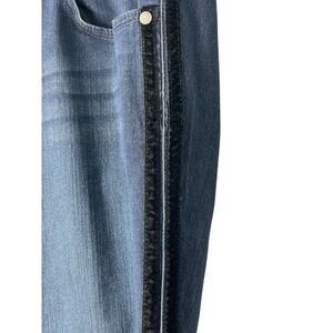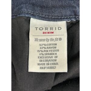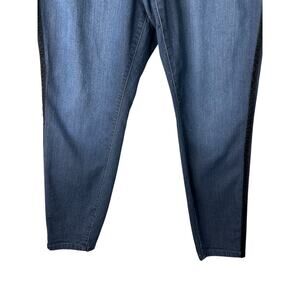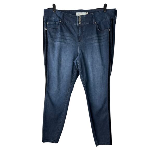 The Torrid Women's Size 20R High Rise Tuxedo Stripe Super Stretch Jegging is a stylish and comfortable pair of jeans designed for plus-size women. Made from a medium wash denim fabric, these jeggings feature a flattering high rise style with a touch of stretch for added flexibility. The tuxedo stripe adds a trendy element to the classic blue color, making them a versatile and chic addition to any wardrobe.