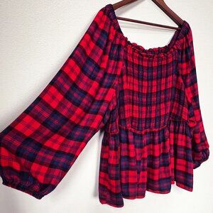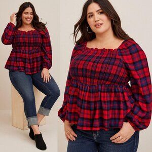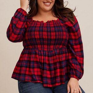 Torrid Kelsey Plaid 4X Soft Brushed Rayon Acrylic Smocked Peplum Top Plus Red