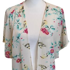 Torrid Kimono Duster Sz 2/3 2X/3X White Pink Floral Birds Sheer Flutter Sleeves