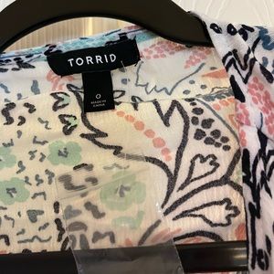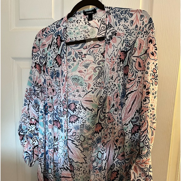 New!!! NEVER worn Torrid women’s kimono. Light weight open with no buttons. Fits women size 12-16. I took the original tag off but buttons are still attached.