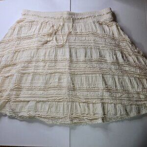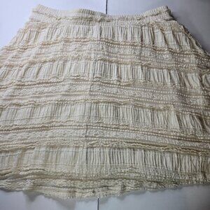 Only worn a few times, this is a plus sized Torrid skirt in a size 2. It has a nice stretchy elastic waist that has a smocking detail and tie front. It is a cute boho cream lace skater skirt. Nice inner lining, see photos for additional wear details.