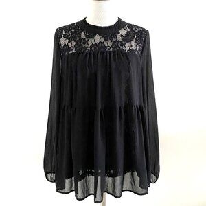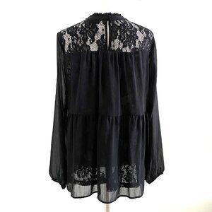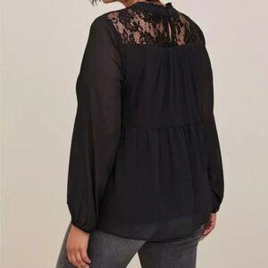Torrid Lace With Chiffon Overlay Blouse Black in size 1. Beautiful blouse. Lace yoke and lining. Crinkle Chiffon woven fabric. Mock neck. Back neck button closure.