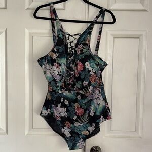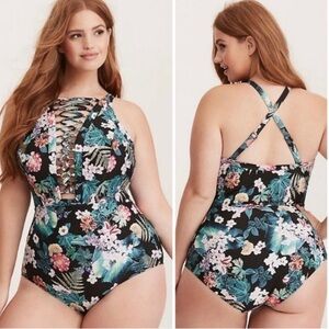 Torrid lattice neckline tropical print one piece swimsuit. Very slight wear on rear as seen in photo. Size 2 = US 18/20. Good pre owned condition