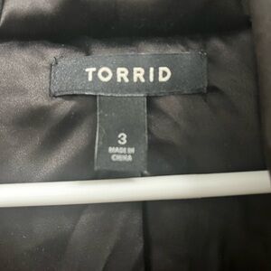 Size 3 Torrid Faux leopard Fall/Early Winter Jacket. Super comfortable- not meant to get wet. Brand new- never worn. Has snaps instead of buttons.