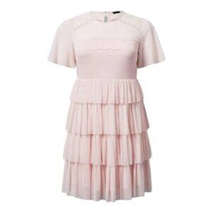 Light Pink Mesh & Lace Tiered Ruffle Mini Dress w/ Short Sleeves Size 12