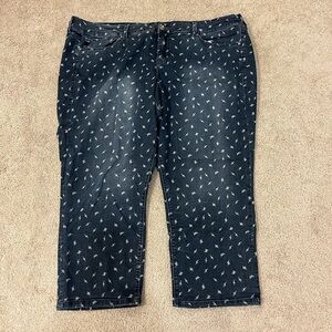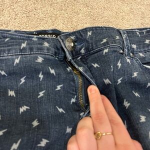 In good shape! Stretchier Jean material than usual. Cute lightning bolt pattern! Front and back pockets! Inseam measures 24 inches and waist measures 22.5 inches. Perfect for any occasion! Offers always welcome!