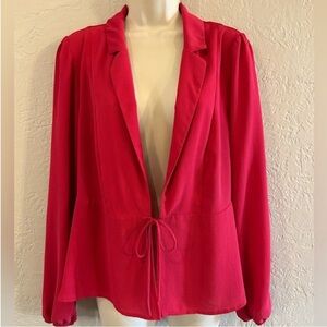 This vibrant red (red with a little hot pink) blazer from Torrid features a stylish open-front design with notched lapels, offering a relaxed, lightweight, and comfortable fit. The long sleeves and soft, textured fabric make it a versatile addition to any wardrobe, perfect for layering over your favorite outfits.