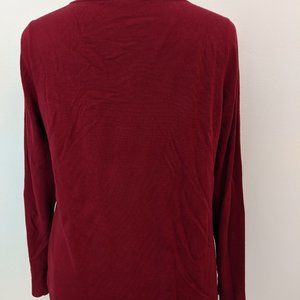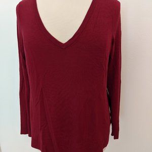 Just the right weight for transitional seasons or warmer locations. Basic v-neck with full sleeves. Rib knit on cuffs and neck. In excellent used condition with no flaws and no pilling!