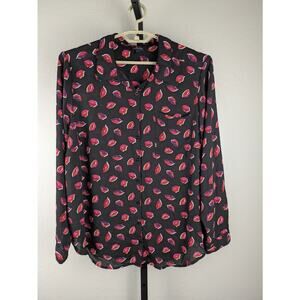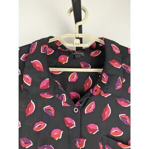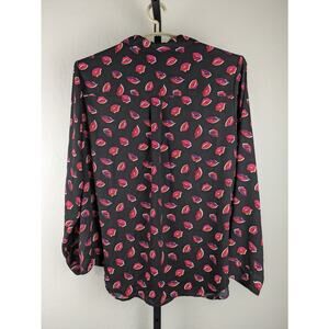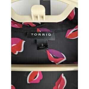 Torrid size 3X Lizzie Georgette Button-Up Long Sleeve Shirt. Collared, single chest pocket. Black with red, pink and purple lips print. 100% polyester semi sheer chiffon.