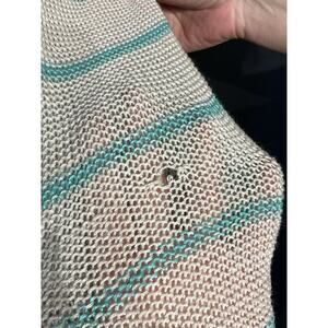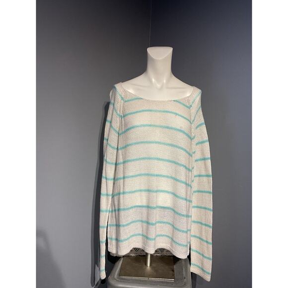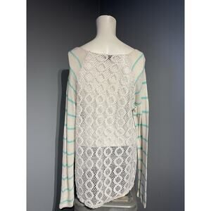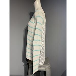 Elevate your casual wardrobe with this Torrid long sleeve knit tunic top in size 1. The cream and teal striped pattern adds a bohemian touch to the classic style. The round neckline and casual sleeve type make it perfect for travel and everyday wear. Small hole on the back of sleeve see last picture.
