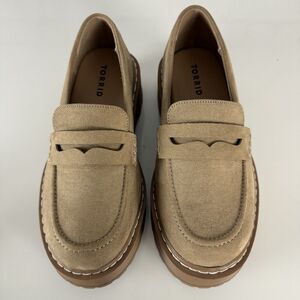 Torrid Lug Sole Penny Loafers Platform Shoes in Tan Faux Suede Upper Women Size 7 WW.