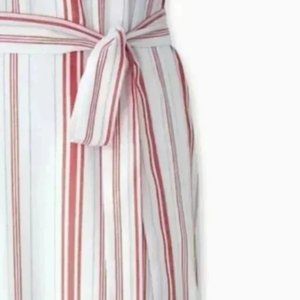 Torrid bohemian style red and white stripe maxi dress. Shirred hem. Woven fabric. V-neck. Adjustable spaghetti straps. Non-removable self-tie waist. Pockets.