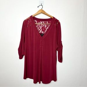 Torrid Merlot Floral Lace Back V Neck 3/4 Sleeve Burgundy Blouse Plus Size 3X