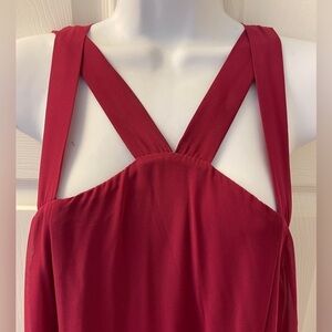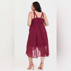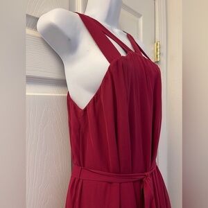 This gorgeous, Burgundy, Torrid NWOT dress features a strappy crossed halter neck and a matching fabric sash belt. Tie it in front or back. It’s a beautiful and classy semi-formal maroon shade dress. It has a hi-lo hem and is a semi-sheer light organza bottom. It’s lined halfway down. Flattering silhouette Sz.0