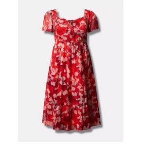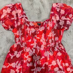 Embrace vibrant style with this red floral midi dress from Torrid. Featuring a flattering silhouette with short sleeves and smocked detailing, this dress is perfect for any occasion. The beautiful floral print adds a touch of elegance and charm, while the lace-up neckline offers a stylish finish. Made with a comfortable blend of polyester and cotton, it ensures a soft and breathable fit. Ideal for both casual outings and special events.