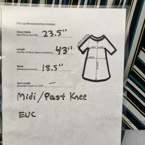Flat lay measurements (approximate): Chest: 23.5 inches, Length: 43 inches, Waist: 18.5 inches