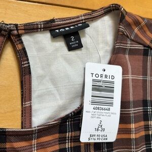 Torrid Midi Light Weight Studio Ponte Dress Size 2X (18-20) New With Tag Brown Black Plaid. Chic academic look. More Torrid items on my page. Chocolate brown colors throughout. Smoke-free home.