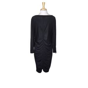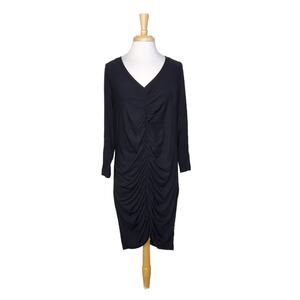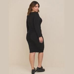 This dress celebrates your curves with a figure-hugging silhouette, soft jersey fabric and ruching down the center. The mini length and deep V-neckline add a touch of allure.