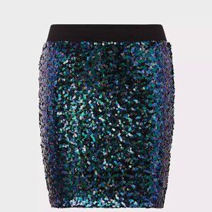 Multi-colored sequins lend a fun yet elegant shimmer to a stretchy, figure-hugging mini skirt.