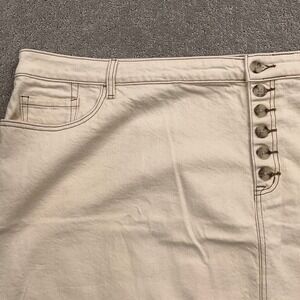 A stylish and versatile mini denim skirt from Torrid. This skirt features a button-fly closure, adding a touch of vintage charm to its modern design. The skirt includes functional front pockets. The natural beige color is neutral and easy to pair with a variety of tops and shoes. The skirt is designed with contrast stitching, enhancing its overall aesthetic appeal.