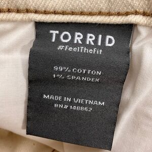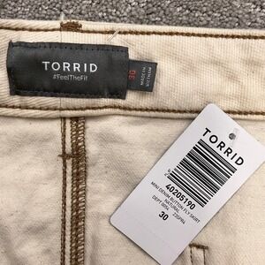 Keywords: Torrid, mini skirt, denim skirt, button fly, plus size, size 30, natural tan, casual skirt, womens skirt, cotton skirt, new with tags, NWT, contrast stitching, front pockets